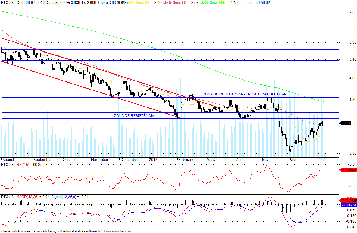 PORTUGAL TELECOM - antes de tomar qualquer posição nesta acção é preciso deixar que ela se clarifique, ou seja, terá de quebrar ou não esta 1.ª zona de resistência. Só depois de ver a reacção da acção a esta zona dos 3.70/3.85 é que devemos equacionar qualquer tipo de posições.